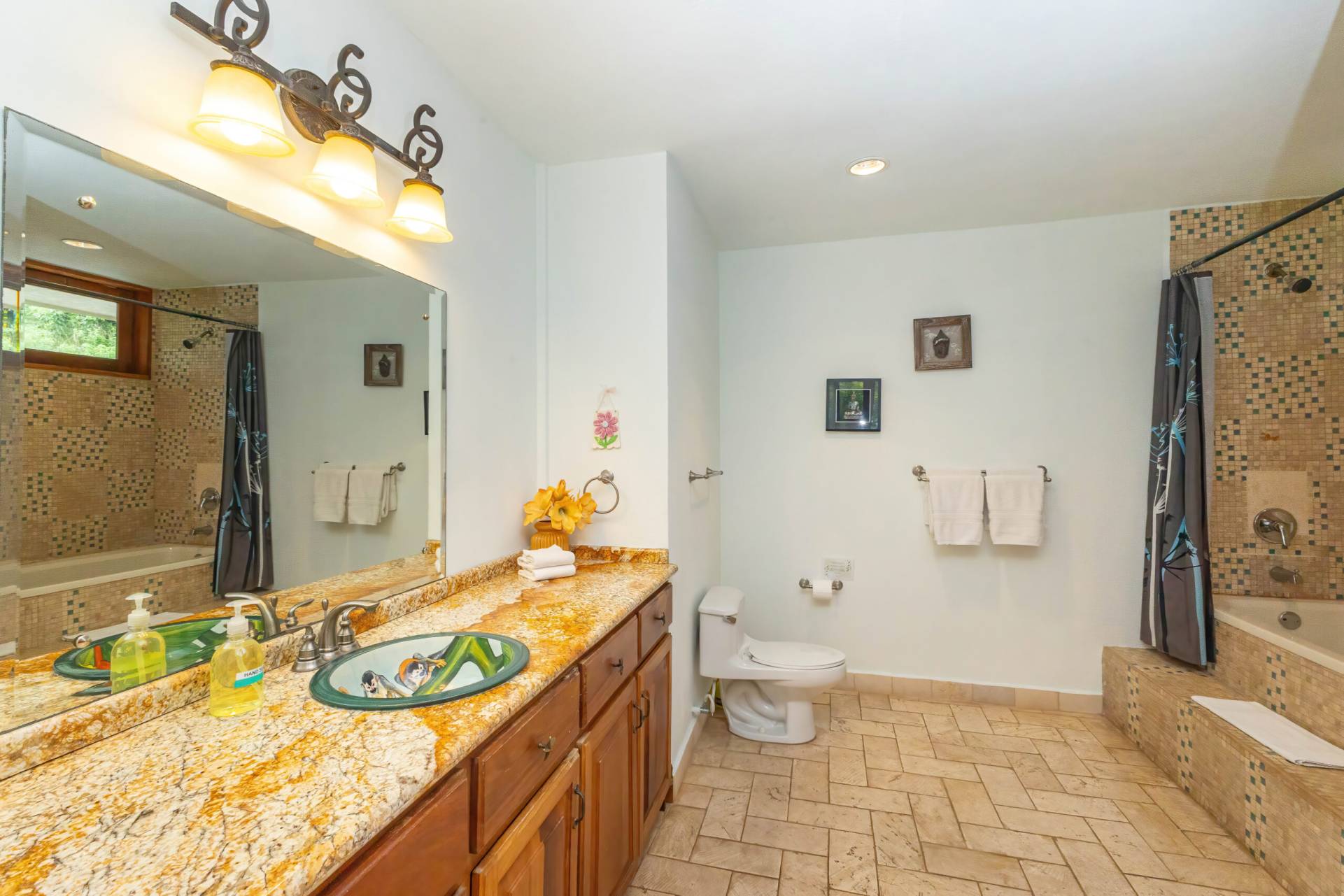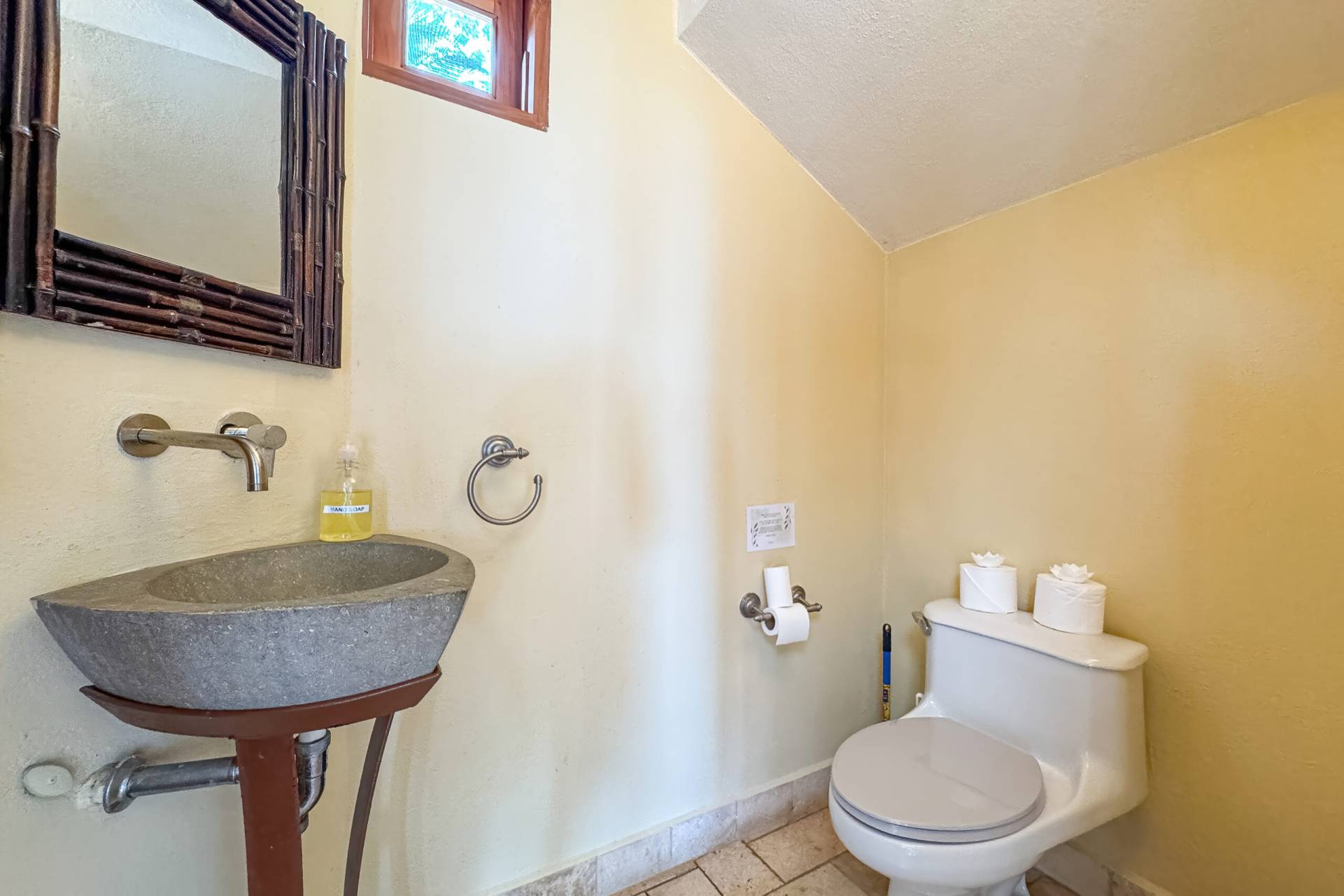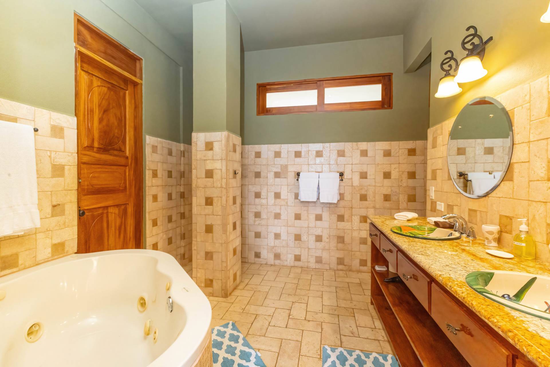 Bathroom is equally outstanding and offers his and hers sinks, wooden vanities, black countertops, and a custom-made outdoor shower and bathtub with jungle views. The third level offers spacious outdoor living areas with impressive views, like all other points of the house. This floor hosts 3 guest rooms, room 2 has a king bed, ensuite bathroom, while rooms 3 and 4 have a king bed each and a Jack-and-Jill bathroom. In the lower-entrance level, adjacent to the laundry room there is a 5th bedroom with a queen bed and private bathroom, referred by the owner as the “staff quarter” bedroom. Allowing to accommodate up to 10 people. Casa Pura Vista was completely renovated in 2023 with several high-end upgrades such as a solar panel system, an elevator, backlited dimmable light controls, Wi-Fi, Air conditioner, TV in each room, and hand-woven wool rugs. Due to its location at a hilltop traffic is almost null, giving guests a great feeling of privacy.