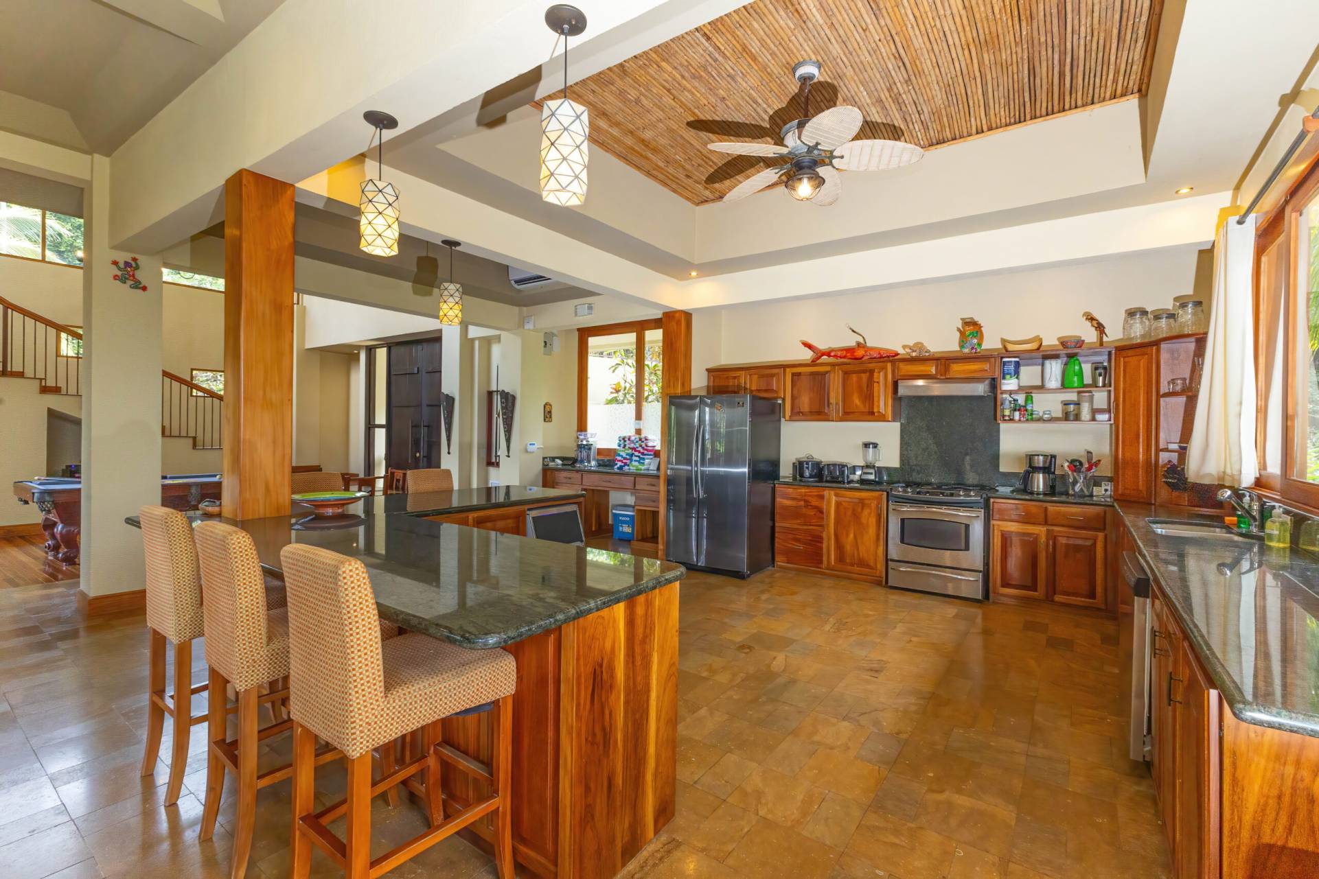 You enter the home through the oversized tropical hardwood doors and from the moment you open the doors you are overwhelmed by the views and architecture. The main level hosts a beautiful cooks kitchen, spacious dining area which spills out onto the pool deck, a wet bar and living area. The home is designed to open up all the doors and live indoors and outdoors while you marvel at all the beautiful views. The top level of the home hosts three spacious bedrooms, including twin ocean view masters, each with their own private almond wood terraces and on suite baths. The third bedroom is a spacious jungle view room, equipped with multiple beds and bunks making it a great kids room and is complete with its own tropical bath.