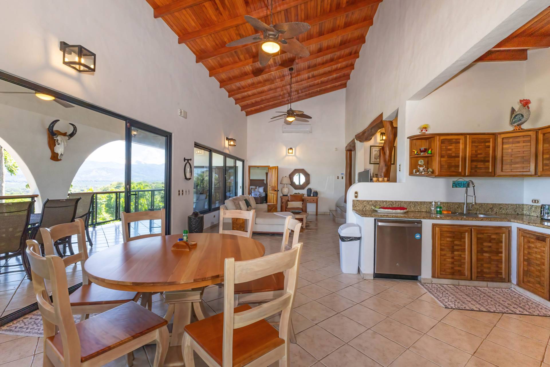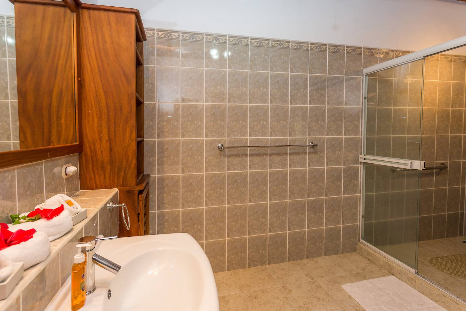 The bright and airy house features ceramic tile floors and tropical hardwood trim throughout. There are three bedrooms: The Master bedroom has ocean, town and mountain views and comes with a king-size bed, flat-screen tv, walk-in closet, full bathroom, and doors that open onto the deck and pool. The second bedroom also has views to the ocean and town and is equipped with a king-size bed, closet, flat-screen TV and full bathroom. The third bedroom has a King bed and features garden views, flat screen tv and a full bathroom.
